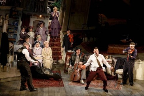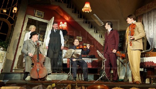 The motley crew each has their own quirks and signifiers. The well mannered Major Courtney (Simon Day) is overly fond of Mrs. Wilberforce’s dresses and unmentionables. The enormous and lovably dim witted One-Round (Chris McCalphy) blurts out the wrong thing at the wrong time. Hilariously he “plays” the cello by sticking it under his chin like a violin. Con O'Neill (Louis) the knife throwing Romanian is played like George Raft on speed.