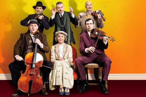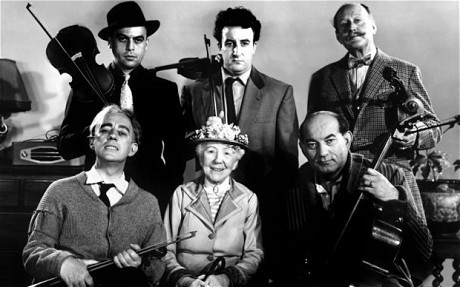 Somehow she has become implicated as an accomplice in the crime. The Professor leverages this to suggest that she will do hard time unless she plays along. She in turn bargains for the string quartet to play a concert for her women’s group. Half of whom appear to be in drag.