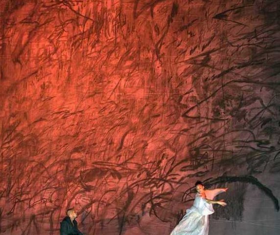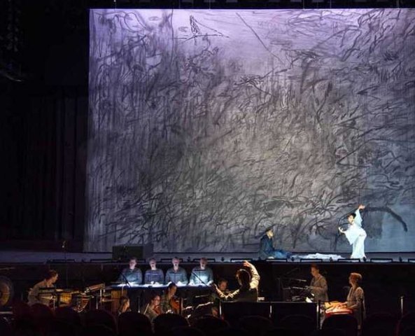 The background paintings of first-time stage designer Julia Mehretu have the same texture as the composer’s music. Three artworks are translucent drop downs. They are a tangle of lines which successfully merge as the music does. They also reflect the reeds and cattails of a river bank, near which many Noh dramas take place.