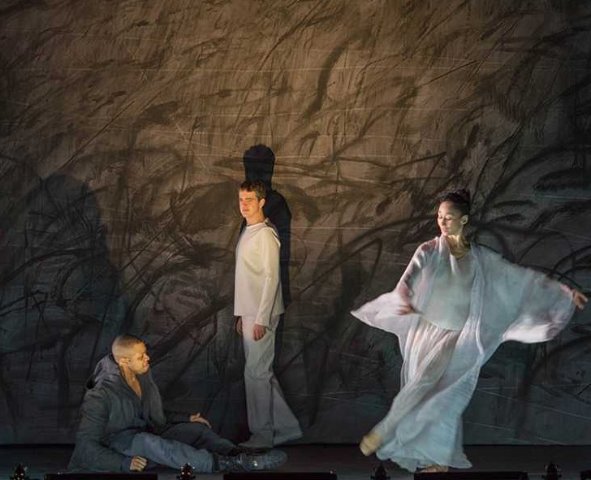 The white robe which is stolen from an angel by a fisherman in the second story is both feather light in the lighting and also seen as a weighty piece which burdens the fisherman’s dilemma. The angel is a double figure, sung by counter tenor Philppe Jarousskey and danced by the special Nora Kimball- Metzos.