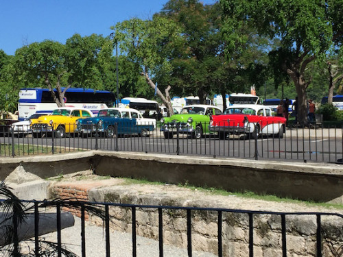 Farewell dinner. On our final night, we left the Hotel Nacional for our farewell dinner, expecting to be transported by our HavanaTur coach number 3779. Instead, a fleet of gorgeous 1950s convertibles was waiting for us and we cruised around the city like locals to the paladar where we dined. I rode with Miguel in a 1959 blue Ford convertible. On another occasion, I had a taxi ride in a 1973 Lada, with no window glass or seatbelts. The driver called it his Russian jalopy.