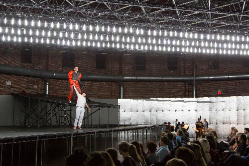 The Cyclorama, originally built in the 1880s to house a gigantic cyclorama of the Battle of Gettysburg, which has been used for opera only once or twice before, was an inspired choice for a venue. A raw but awesome space, it is acoustically unwelcoming to unmiked music, but acoustician Carl Rosenberg working with set designer Julia Noulin-Mérat largely solved the problem, padding its walls with reflective panels and placing sound-absorbent pillows on the folding chairs to make the sound more lively and warmer, not to mention more comfortable. There were only a couple of dead spots, which stage director R.B. Schlather wisely kept his singers away from for much of the action. Although the Cyclorama is not the answer to the BLO’s long-term need for a real opera house, it should be considered by the company as an alternative venue, especially for its Annex productions, in the future.