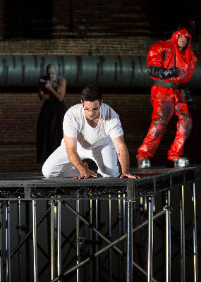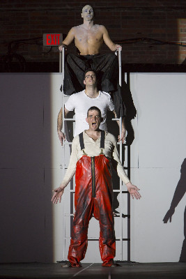 Noulin-Mérat’s set, a metal pipe construction the agile singers climbed over as if it were a jungle gym, was simple and efficient. Lighting designer Jax Messenger created ominous contrasts between dark and light and threw shilhouettes of the characters against the backdrop that underlined the work’s alienation. Terese Wadden’s costumes were effective: a white t-shirt and pants and horn-rimmed glasses for the Visitor, a dirty red hazmat suit for the Officer/Executioner and the modern primitive outfit for the Man/Prisoner.