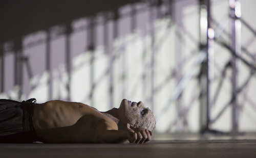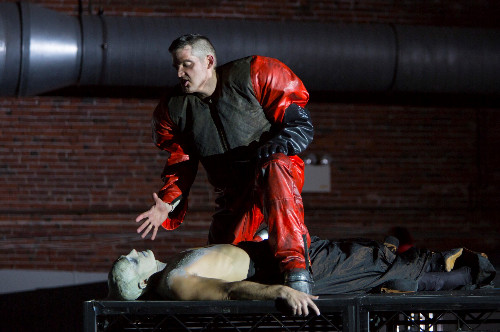 The stasis inherent in the work, the story and the opera, challenged stage director R.B. Schlather, who sometimes rose to the occasion and other times didn’t. It was smart to combine the two non-singing roles and to cast former Boston Ballet principal dancer Yury Yanowsky in the part. With a beautiful bared upper torso, a shaved head slathered with white paint and a long billowing black skirt, he resembled both a Butoh dancer and a modern primitive. His moves were feral and articulate even though he didn’t sing a note. And it almost seemed foreordained that he would be the object of homoerotic desire. At one moment, he and the Visitor nearly kiss.