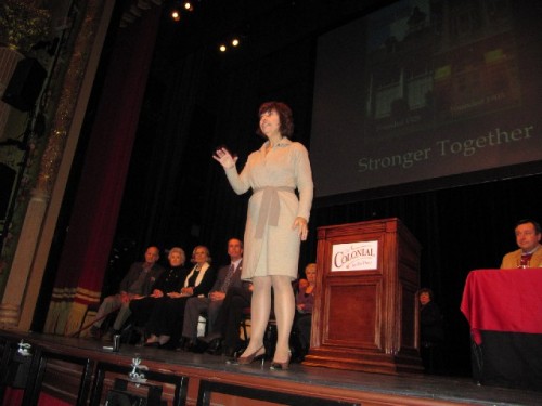 The audience was wowed by Maguire. Rightly so. She lights up a room with her megawatt charisma and personality. There were a number of speakers on stage, as well as a dense section of board members of both organizations, which sat mute. When it came her time to speak Kate stepped out from behind the table and microphone to perform standup for the utterly charmed audience.