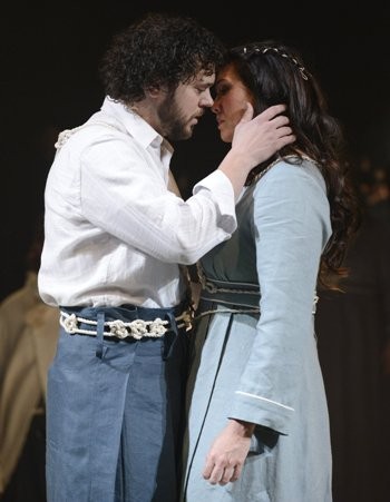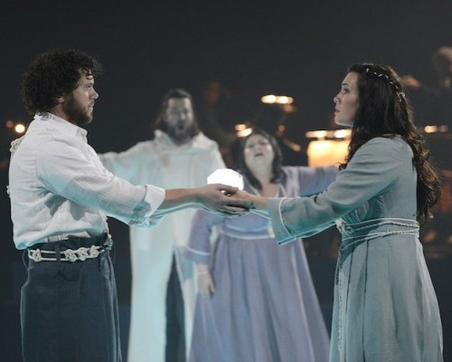 The Martin adaptation runs for only one hour and forty-five minutes – the BLO wisely did it without intermission – as compared with the Wagner, which runs nearly four hours (not including intermissions). Still, Martin added characters and subplots including a second Isolt, this one called “of the White Hands” (the name is spelled Iseut or Yseut in Medieval French, Isolde in the Wagner and Isolt in the Martin), whom he reluctantly marries when he thinks the Isolt he loves has abandoned him. In the end, in both versions, both Tristan and Isolt die. In Wagner, from drinking a death potion, but in Martin, Tristan has been wounded by a poison lance, and he dies without realizing that Isolt the Fair has returned to be by his side. When she arrives, she dies beside him, and when they are buried, a bramble grows from his tomb and enters hers, uniting them in love for eternity.