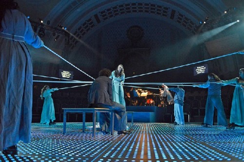 The synagogue’s pews were removed and a circular stage was centered under the tawny yellow dome with a Star of David at its center. Rows of bleacher-like seats surrounded the stage. At its center was a pile of crystal-like stones that glowed with a mystical light, sending a double pillar of light upward to meet the dome. The performers entered wearing hooded robes of white, roughly woven cloth, tied with ropes in Celtic knots. The twelve singers functioned as the chorus, circling the central stage, gesturing in unison, their movements choreographed in a highly stylized manner. As was common in Medieval and Renaissance dramatic music, the principals emerged out of the chorus, returning to it once their solo was done. Almost immediately, one was drawn into the spell cast by the creative team and performers working in concert.