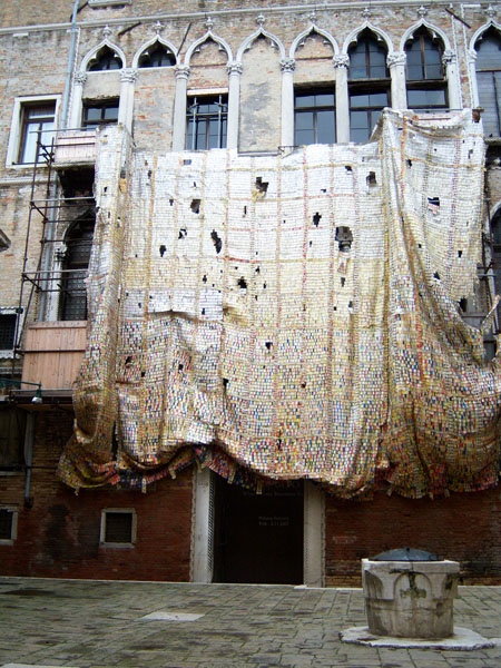 Charles noticed a banner for the Fortuny Museum , a participating venue of the Biennale. He had received a couple of e-mails from colleagues urging him not to miss this exhibition. The museum was hidden at the end of a tiny calle, but a jewel. A huge curtain, deteriorating in plain air, made by the African artist, El Anatsui, covered most of the three story facade. (El Anatsui's work was the sensation of this year's Biennale. Two other such "curtains" are exhibited at the Arsenale. They are made of aluminum liquor bottle caps or bottle neck bands and copper wire.) Several Biennale artists exhibited videos on the first floor. The second floor held a collection of Curiosity-Art, objects of exotic origin. There were two bodies which may have come from the Body World exhibitions, which I had seen in Boston, and wrote about for BFA. These are perfectly preserved real bodies, minus the layer of skin. (We can not be sure of the origin of these two sculptures.) Another large sculpture was made of hundreds of beetles. Large glass vitrines held many objects to marvel about, but not necessarily marvelous objects. On the top floor I held my breath. It was an airy, wide open space. The works installed on this floor consisted of several, knife-slashed Lucio Fontanas and nail-paintings by Zero artist, Heinz Mack, including the best work of art by Mack that I have seen, a nailed chair. These approximately 1960-1980 works were juxtaposed with Asian or Asian-inspired works. The top floor felt in its entirety like a work of art. We agreed with the Palazzo Fortuny's pronouncement: "Artempo – Where Time Becomes Art."