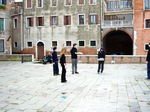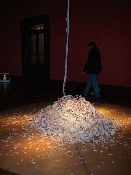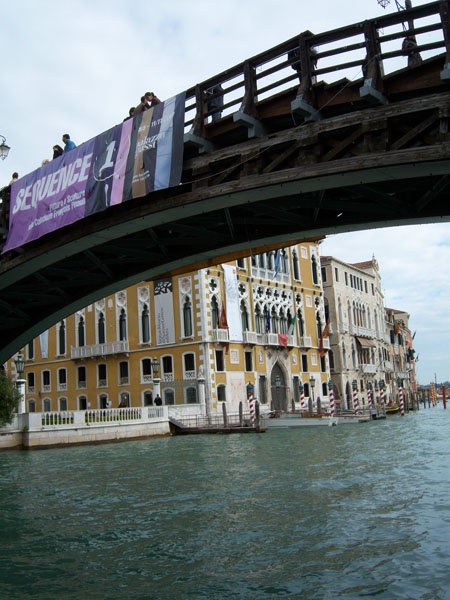 The first palazzo we visited, had beautifully maintained grounds, and the only orange tree that we saw in Venice. It was the site of the Singapore Pavilion. We entered the large entrance hall, which lead to the grand staircase and exhibition spaces. It was a marble palace with huge chandeliers made of Murano Glass. There were probably five chandeliers and smaller glass wall lamps placed in several rooms and a banquet hall. The most significant work was done by a well known glass artist in Singapore. He spent a year working on a chandelier, which was hung in the largest exhibition space and released with a dramatic crash from the ceiling during the Opening Reception. (A small monitor played the moment of destruction in a continuous loop.) There it was shattered lying on the floor, in a heap with many bits and unbroken pieces of mostly opaque colored glass. All that remained of a year's work. In my mind it symbolized the passing and destruction of all life and matter, performed in the city, which may be doomed by the end of this century.