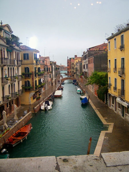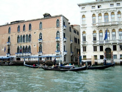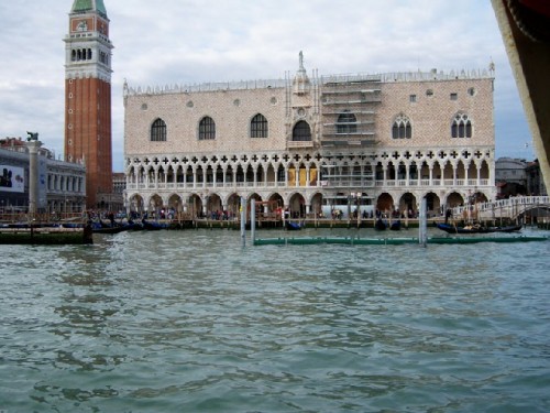 The train ride from Padova to Venezia takes only an hour. The closest town to Venice, still on land, is Maestre, where many people, who work in Venice live, and where the University is situated. We learned that from a Philosophy student, a fellow passenger, who studies at the Mestre. Only recently did we hear from our friend, Jan Nelson, that the oil refineries in Mestre still pollute its surrounding water ways and the Grand Canal of Venice. Unbelievable! The train passes an industrial zone and many large oil containers. Also, we remember the train tracks completely surrounded by water for several minutes before we arrived at the Venice station, Terminal Fusina. From there we took our first vaparetto, the water bus, to the Academia stop. Our hotel, the Conference Center Don Orione Artigianelli, was just three minutes away from the Academia Museum right next to the stop. The adjacent Academia Bridge is one of just two bridges spanning the Grand Canal. (The first vaparetto stop from Terminal Fusina, Zattere, was actually closer to our hotel and opposite the island Giudecca, originally the Jewish Island.) We were centrally located and away from the tourist areas near the Piazza San Marco ( San Marco Square ). Our location was perfect. In Venice, one walks or uses the vaparetto. The Police, Fire, Ambulance, and all deliveries come by boat. Cranes and building materials float to their locations. It is a unique experience – and must be seen.
