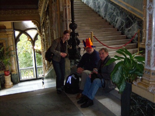 Yes, Venice was the highlight of our trip, and the core around which we planned our seven city vacation and celebration. We spent the first two days at the Venice Biennale, the oldest, large scale, international art exhibition (since 1895). During our six nights in Venice we celebrated Charles' birthday and enjoyed a family reunion. My cousin, Horst Hiemer and wife, Bettina, arrived a few days later on the weekend. We spent two wonderful days with them and a sunny day after an overcast and rainy week. By then, we had explored the major sights and were able to share with them exquisite locations: Palazzos, churches, museums, and Piazza San Marco, all seen in a busy day. We started our adventure on the Academia Bridge with its wonderful views, in both directions, of major hotels and palazzos along the Grand Canal. We even bought a Harlequin hat for Charles and two small ones for Nola and Lena, each decorated with many small bells. Hmm!