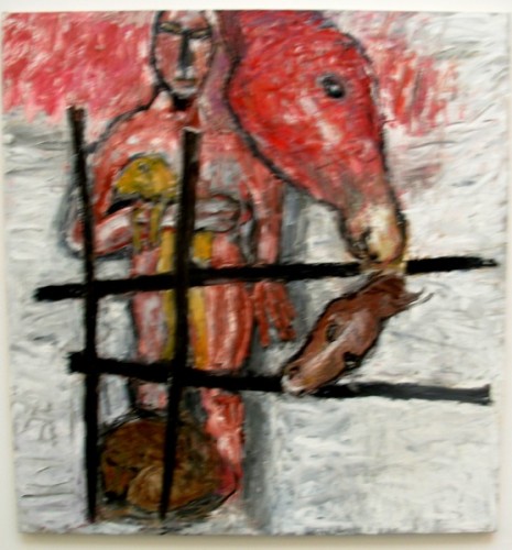 Walking around the Italia Pavilion I found myself getting more and more annoyed hoping against hope to find something new and interesting. Faggedahboutit. Instead, there, once again were those odd little "shaped" cartoony, brightly colored, last works by the late and overrated Elizabeth Murray. Her MoMA retrospective bored me to tears and it wasn't any better to experience a few of those paintings yet again. Ditto Susan Rothenberg and those Fences and Horses. Why? She lives out West with Bruce Nauman and his take on it is a lot more interesting. Her presence here is described as a coup as she rarely consents to be including in such exhibitions because she resents being one of the token women. But Storr really didn't do me a favor as I have never been terribly interested in that work.