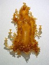 Pixnit, Julie Chang, and Timothy Horn emphasize the impact of the present on the past, transforming traditional sources in surprising ways. Horn casts a carved wooden mirror from the 18th century in rubber in "Mutton Dressed as Lamb," and the switch of material makes a busy, already quite mad object into an alien and weirdly attractive one. The rubber has the hue and translucent quality of amber, but the softness of the rubber causes the branches and the flowers to sag and wilt. The ornate details become even more organic now that they're soft and almost fleshy