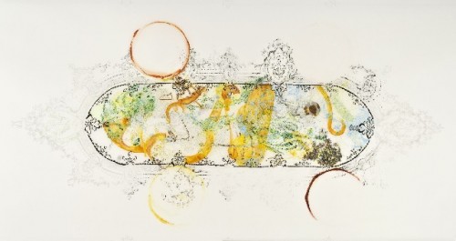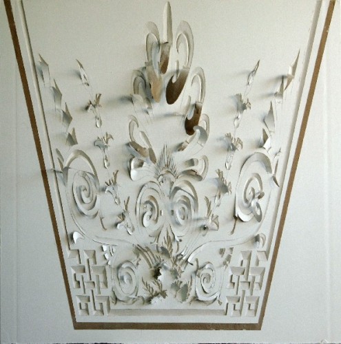 Tomás Rivas also recalls the floral adornment of Rococo fantasies, carving ornate and nearly abstract patterns into the most grimly fragile of contemporary surfaces, wallboard. His patterns would all preserve the valued symmetry of a bygone age, save for how he slants the lines in exaggerated perspective, as if glimpsed on the edge of a camera's field of view. This manipulated and fragmentary glimpse of an antique architectural order becomes a remnant, an instance of a modern eye finding a quaint attraction in some old wreck.