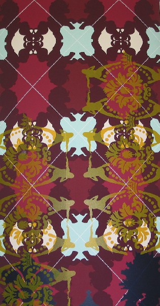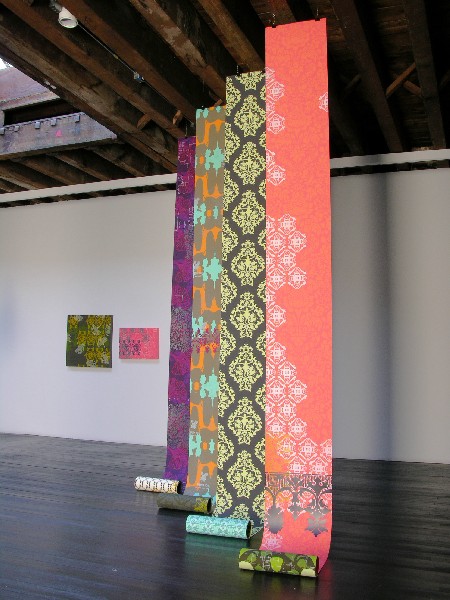 This is also what Julie Chang does in her multi-layered patterned scrolls, though with more of a dry wit than a caustic political message. Chang's complicated stencils simulate wallpaper, but the component elements are quite modern: "My Pretty Pony," photos of herself and her father, fragments of phrases and diagrams from commercial signage and brochures. Even more than her masterful application of acrylic paint through seamless stencils, it is her color sense that elevates the work beyond mere pastiche. Deep purple, royal red, oranges, aquas and teal greens all harmonize in shades that recall velvet fabrics and precious jewels. The bling may change, Chang seems to say, but the messages of status and social stratification do not.