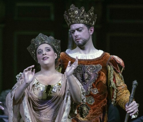 As Orfeo, Aaron Sheehan sang the role of lifetime. Tall, handsome, noble in bearing, he was exultant in joy and devastating in grief. A fellow among his shepherd friends, he glowed with happiness during the festivities preceding his nuptials. In a spirited country dance, the shepherds circle him, one of them poking him lovingly on the shoulder. With his sweet tenor, Sheehan recalls his sadness not long before of having his love rejected, “Do you remember, O shady groves,/My long and harsh torments/…..I lived then in sadness and sorrow/Now I rejoice, and those torments/That I suffered for so long/Make my present happiness much dearer.”