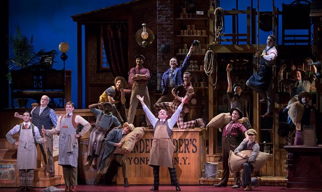 Scenic/costume designer Santo Loquasto’s excellent work includes eye-popping character- and period-appropriate outfits. Also, his depiction of The Harmonia Gardens restaurant is elegant and stylish, with red the predominant color. By contrast, the busy, cluttered look of Vandergelder’s Hey and Feed store suggests he could use an assistant as efficient and talented as Dolly. Sometimes, the colorful sets, painted backdrops and costumes evoke a sense of pure Americana. They might bring to mind The Music Man.