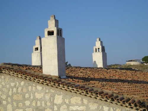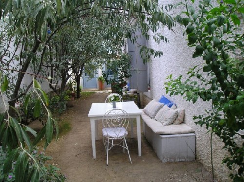 Ulku, another high-school classmate, who spends her summers with her daughter in Alacati, joined us for breakfast. I went home with her for the next four days. Their place, built by her Italian son-in-law, was a modern version of an Alacati house, keeping in character with its whitewashed thick walls. Blue wooden shutters decorated the walls of the single-storied house and revealed flower pots in the recessed windows. All the rooms lined both sides of a long corridor featuring skylight windows. Located on a quiet back street, the house opened onto a patio with a built-in fire place and an olive tree. The interior decor reflected the simplicity of the architectural design, with sparsely placed contemporary furniture.
