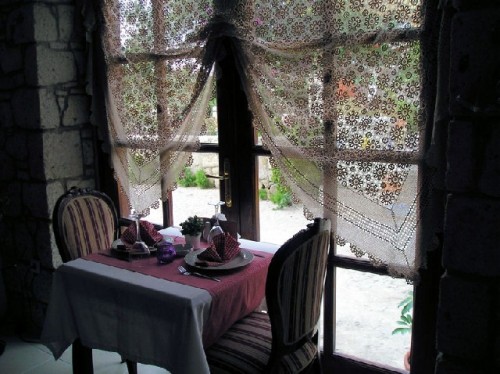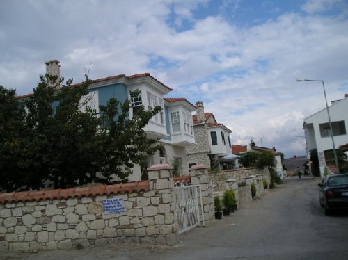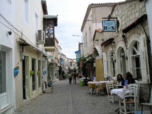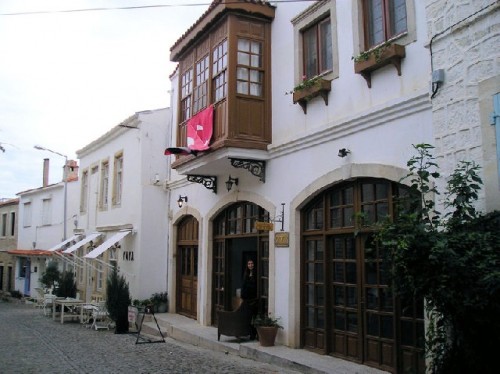 My friend Goksel met me in front of the old town hall, where I was dropped off. A high school classmate and a former parliamentarian from Ankara, she has retired in the charming town of Alacati on the Cesme peninsula. She lives in a restored old house with whitewashed stone walls, and a second-story wooden bay window. We entered the house through a long narrow hallway with high ceilings. Traditional benches with embroidered cushions lined the walls; hand-crocheted curtains hung in the vertical long windows. We climbed the wood stairway to the second-floor receiving room, which opened to an entrée facing the bedrooms, all traditionally furnished with hand-woven textiles. Quickly leaving my bags, I descended to the living/dining room for breakfast.