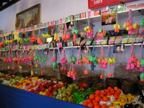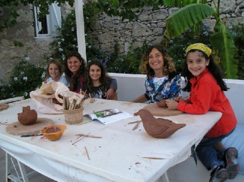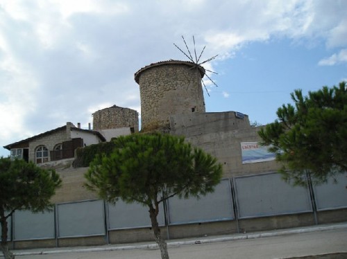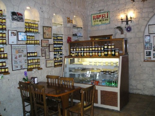 Goksel and I walked through the town center to the landmark old windmills on the highest hill. These windmills in stone were built in the late 19th century to grind flour, and now grace the landscape as reminders of bygone days. On the way I noticed a shop with colorful displays of soap, molded to look like fruit, from grapes to bananas, placed in bins. Charmed by the novelty, I decided to come back later to buy a basket of "peaches" and "pears". We continued our walk, following signs to the Arts and Crafts Gallery, where we watched a ceramics class for children and bought one-of-a-kind textiles.