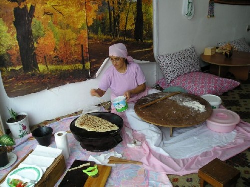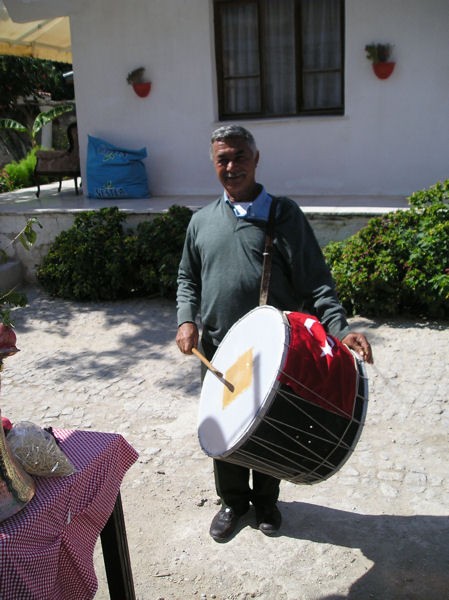 The next day was the first of a three-day Bayram, a religious holiday following Ramadan, called "candy festival" by Turks, because of the tradition of offering sweets to friends and relatives who visit. We were invited for breakfast to the Sesil Hotel, whose owner was a friend of Goksel. The spread, which would easily qualify as brunch, included home-made pastries, eggs, a variety of cheeses, jams and breads, accompanied by tea. The extensive breakfast ended with baklava, coffee and sour cherry liqueur. I was able to see a few of the unoccupied rooms, whose elegant furnishings were for sale to customers wishing to purchase them at the end of their stay. My take was a bag of home-made noodles, courtesy of the hotel's owner/manager. As we stepped out to the street, we were greeted by a drummer, who played for us cheerfully in return for Bayram tips.