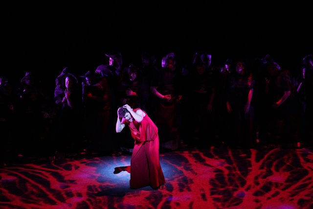 Another strong visual element is Rena Butler’s choreography. Orpheus and Eurydice are each replicated by three dancers wearing costumes in different shades of their respectively assigned colors to represent different stages of the couple’s relationship. The many dances are evocative, stylistically dominated by the herky-jerky motions of Orpheus and the sensuality of Eurydice. The chorus’s movement and posturing add another dramatic element, as does their monochromatic sea of color, whether white or black, but often altered in appearance by colored lighting.
