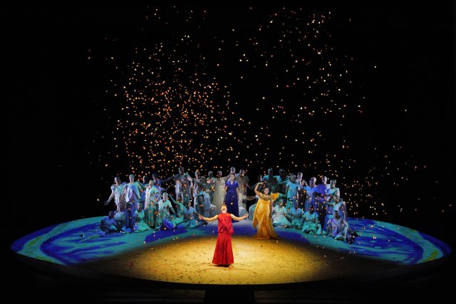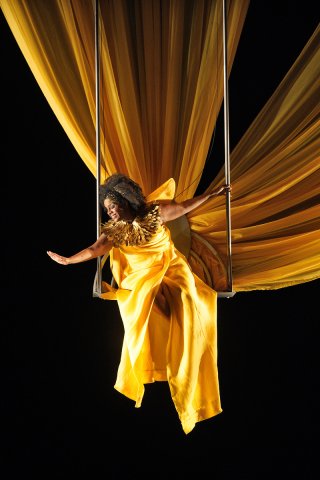 Orpheus’s red and Eurydice’s blue outfits stand with distinction, but Love displays the real eye candy. Not only does her yellow-gold costume sizzle with its brightness and contrast to the black backdrop, but her entrance is a dramatic swing down from the fly, and beneath her trails a drape of perhaps 20 feet of the same material. Now that’s a real fashion statement!