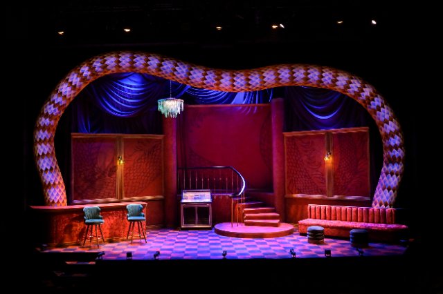 “Dragon Lady” is directed by Andrew Russell and takes place on Randy Wong-Westbrooke’s detailed interpretation of the Red Dragon Club in Manila with its whorehouse red décor. A scrim over a slightly elevated platform mutes the appearance of members of the band Hot Damn Scandal, comprised of guitar, upright bass, and trombone, that creates an astounding sound for the performer’s vocals, especially taking advantage of the mellow tremolo of the brass instrument.