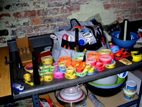 Next to the door of the loft/ studio are metal shelves on which were stacked a stash of bowls. Now that we are in the holiday season Brian is in high production to fill demand for the popular Ticket Bowls. While he expects to sell about a hundred of the pieces during this busy time of year he expresses mixed feelings about doing production that takes away time from more unique pieces and experimentation; to work on shows and exhibitions rather than produce product. Also with the move from California the studio was shut down for some time and he is only now getting back into it.