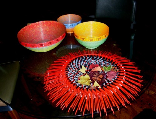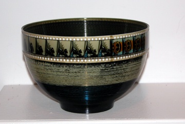 Despite the obvious popularity and demand "I am reluctant to go into high production." He could hire someone to work for him but that would entail running a business and he would rather keep it simple. "I am experimenting with new shapes" he said. "The baskets are one of a kind." We were looking at an elaborate piece on the table where tea was served. It was filled with some fall leaves gathered during nature walks. "I created bowls out of movie film and they sold for $300 each. I made them from Hollywood trailers using 35 MM film and I also bought 16 MM film from schools and libraries that were getting rid of film and switching to DVD. But I stopped doing the Movie Bowls because I kept getting calls from people inquiring what film their bowl was made out of."
