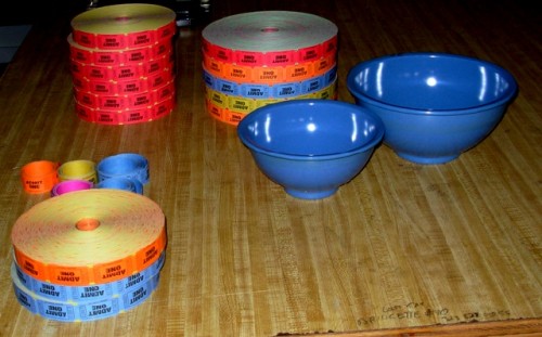 Recently we chatted with the basket maker/ artist, Brian Jewett, who was taking a turn sitting in the gallery of the Eclipse Mill in North Adams, Mass. It was a group show of residents of the loft/ studio building. He was represented by a freestanding "Cactus" sculpture crafted from green garden hose, spiky "needles" and floral red, outdoor faucet handles. On a stand where a couple of his "Ticket Bowls" so named because they are created by carefully surrounding a form with rolls of tickets; the generic kind that are used to purchase drinks at a benefit or raffle items.