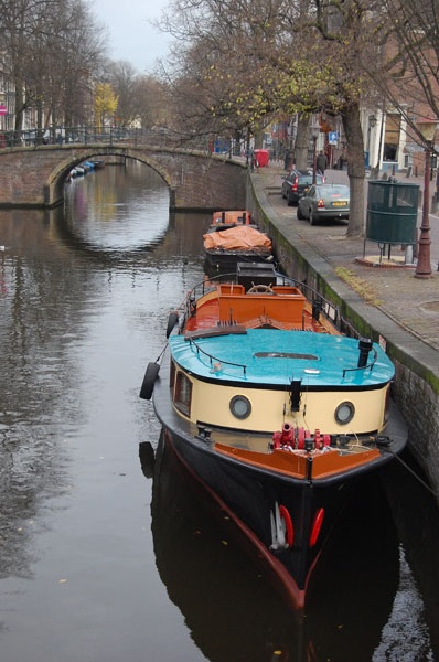 We got off the tram and started walking down the canal street where our boutique hotel was located. Even though we were several blocks away and it was dark, we both loved the architecture and facades of the buildings bordering the canal. We could make out the silhouettes of houseboats moored there as well. After checking into The Hampshire Hotel (Evan had found it on the internet), we asked the person at the desk to suggest a good but not expensive Indonesian Restaurant. Indonesia, the former Dutch East Indies, had a strong colonial connection to the Netherlands. He handed me a business card with the restaurant's name on the front and told us how to get there. We walked along the canal for a couple of short blocks and turned on to a very nice small commercial street.