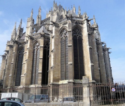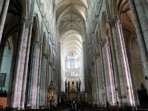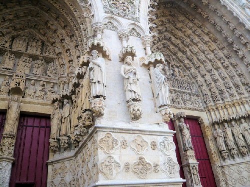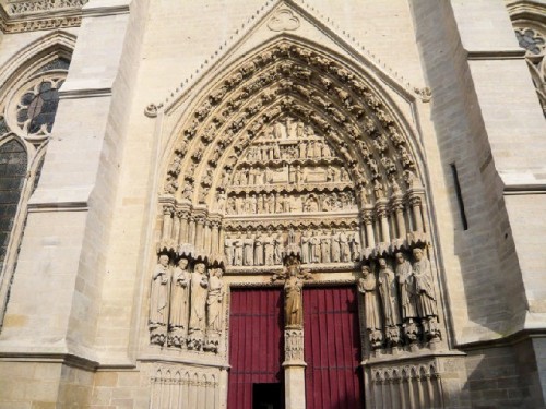 The Notre Dame Cathedral in the same historic district is France's largest Gothic edifice. Begun in 1220, the majestic structure with lacy stonework is 145 m long and 70 m wide, twice the size of Notre Dame de Paris. Its nave is the tallest in the world and its existing spire the oldest. This wooden structure, covered with lead sheeting, rises to a height of 112 m. The main façade has three deep-set portals, featuring groups of carved statues and surrounded by four rows of leaves. One is struck by a sense of immensity upon entering the cathedral with its especially noteworthy statuary. The choir stalls have 4000 sculpted figurines illustrating former trades or representing religious scenes. Noted for the harmony and purity of its proportions, the cathedral was designated a World Heritage Site by UNESCO in 1981 as an outstanding architectural work, and again in 1998 as a stage on the pilgrimage to Santiago de Compostela in Spain. Amiens prides itself on having the Head of St. John the Baptist in its cathedral. The head, set on a silver tray, is brought out for the congregation to revere every year on June 24.