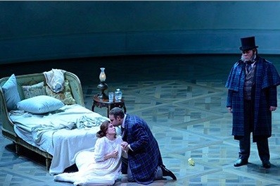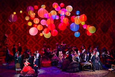Like the Parsifal production, a true marvel in its capacity to entice for five hours, this Traviata is a feast for the eye. A French lace curtain, almost demure, covers the entire stage at the opening. Behind it, during the overture, Violeta’s maid ties the stays in her corset as she prepares for this night’s party.