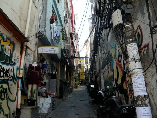 The following morning an optional tour took us to Rocinha (“Little Farm"), Rio’s largest favela, where up to 250,000 people live. We traveled uphill by jeep to an area where people used to grow produce in small gardens, but which now is overbuilt by houses stacked atop each other and set right into the granite. We walked up narrow streets to a promontory with a 360-degree view of the surrounding high-rises, divided from the favela by a pedestrian arch. The descent on narrow alleys with uneven steps gave us an intimate view of houses and shops, providing a glimpse into people’s daily lives — selling empanadas or candy out of tiny windows and repairing bikes on sidewalks. This was a thriving community of low-income people, who seemed to live happily and paid taxes to the municipality to receive services, such as a sports arena with a swimming pool.