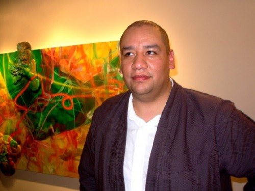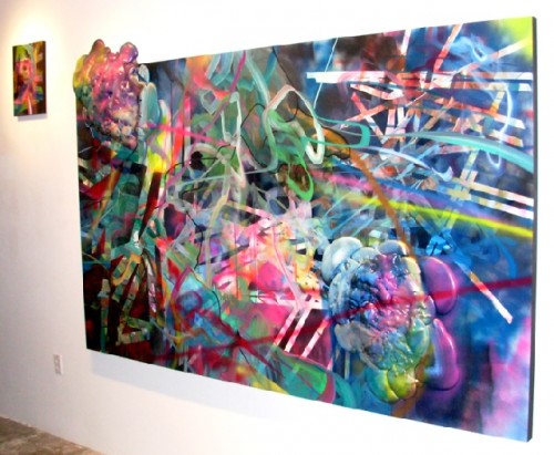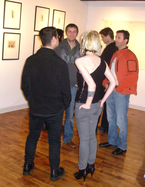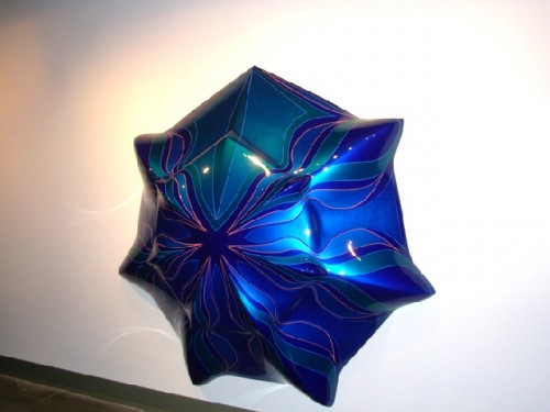 There was a busy round of opening this past Friday night when we toured SOWA the cluster of galleries in Boston's South End. The evening started by contemplating the single work by Vincent Szarek in the window devoted to gallerist Mario Diacono in the bookstore Art Libri. It is a roundish, brightly flavored bluish work in relief. We learned that "Amorphous and Fumed" is "...both a three-dimensional abstract/baroque painting and a star shaped board for surfing the skies." Ok.