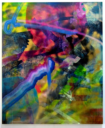 Nexct door at Samson Projects is new work by Jeffrey Gibson which updates what we reported on in the the Aldrich Museum exhibition "No Reservations" which combined Native and Non Native artists dealing with that cultural legacy. The artists has been working on relief sculpture and paintings and occasionally combining them in multi media works. Here the focus is mostly on painting with some relief elements. The greatest change is that he is now working entirely abstractly with ribbons of color and squiggley forms that evoke the influence of the artist Albert Oehlen. In earlier work he was using figurative and narrative elements with bright surreal colors. But he relates that he is in the process of putting a lot of self inflicted burden behind and freeing himself to just explore and paint. Just to see where the work takes him. It will be interesting to follow just where he goes from here.