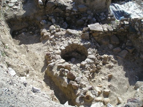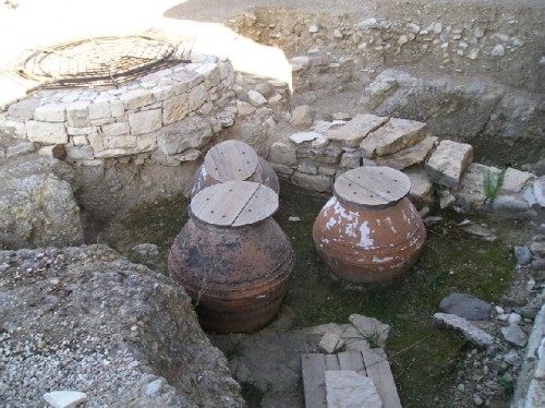 During my two-day stay we explored several ancient sites, beginning with the closest one in Urla, the Ionian city of Clazomenae. Most of the artifacts found here have gone to the museum in Izmir. However, a most interesting aspect of this visit was the olive oil production dating back to 600BC. Digs in 2005 have revealed an industry, including wells carved into rocks for making and storing olive oil in a zone outside of city walls. With expert help from local builders, a replica has been made into a small museum, where one learns about olive oil production, which depended on manual labor before mechanization. Large mill stones crush olives into a paste, which goes into sacs made of goat hair. A heavy stone is lowered over the stack of sacs, pressing out the oil along with the olive's dark juice, which fills two stone wells half full of water. Adding hot water helps the oil to float, which is then skimmed into a third well to settle before it is bottled. This first pressing is known as "cold pressed oil". Plans are underway to create a child-size version of the museum, where children would arrive with their own olives and process it into oil.