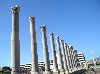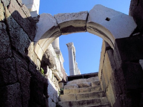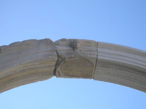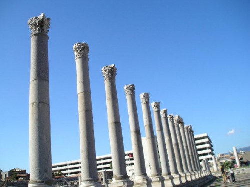 The Agora, which served as the administrative, political, judicial and commercial center, covers a rectangular area measuring 120 by 80 meters at the city center. Basements built to eliminate the gradient of the terrain support, by means of arcs, an elevated courtyard covered with stone slabs and surrounded by porticos (columned galleries). A row of Corinthian columns from the ground floor of the western portico has been re-erected. They are accompanied by a double-arched gate; the keystone of the northern arch has a bust of Faustina, wife of Roman emperor Marcus Aurelius, who restored Smyrna after the earthquake in 178 AD.