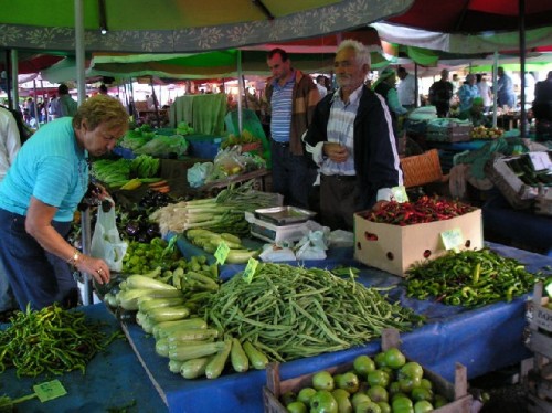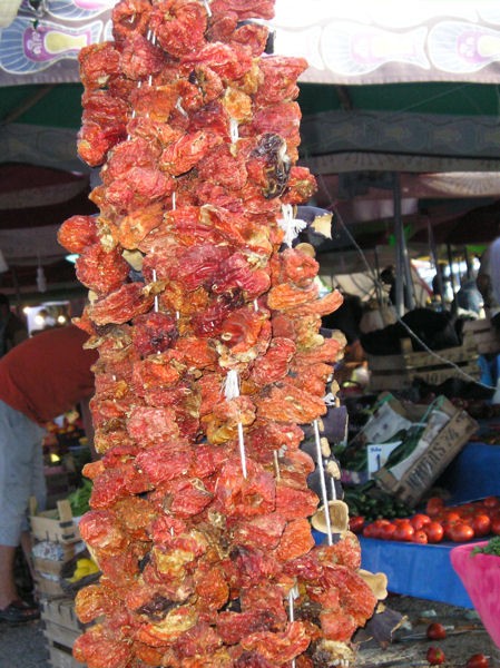 The area is rich in plant life and vegetation. Before returning home we went to the farmers' market, where Evin, as a regular, seemed to know most of the vendors. While she stocked up on fruits and vegetables grown in the region, I enjoyed walking amidst mounds of grapes, melons, pomegranates, black and green figs, fresh black-eyed peas and many edible herbs and weeds, in addition to strings of dry tomatoes and red peppers hanging from the stalls.