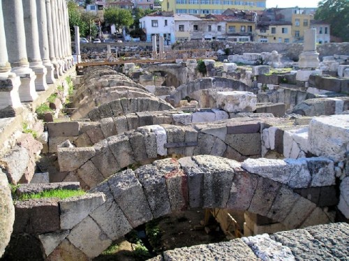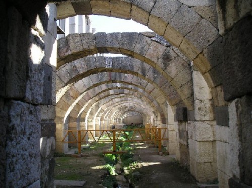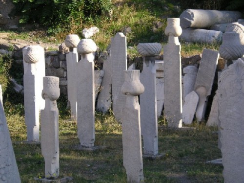 The basilica, which served as the business center, is located along the northern side of the Agora. Two floors, built over a basement floor of four galleries, sit on a superstructure supported by arches. The rectangular ground plan is divided into three vertical galleries with rows of columns; the middle gallery is wider and higher than the ones on the sides. Although the complete structure of the basilica and portions of the western and eastern porticoes have been exposed, totally uncovering this ancient site appears to be a monumental task; currently part of it is under a green park. First used in the Hellenistic period, the Agora functioned as a cemetery during the Byzantine and Ottoman periods, as evidenced from the cluster of tombstones on the grounds. The white marble Ottoman headstones feature different turban styles, indicating the rank and profession of the deceased.