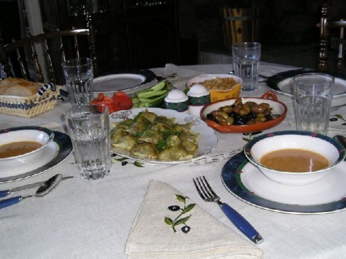 Evin had lunch ready. Customarily Turks have two cooked meals a day. The olive motif on the table cloth and matching napkins were reminders of the importance of this fruit in these parts, where cutting down an olive tree is punishable by law, and an olive tree is priced separately than the land it occupies. A platter of large artichoke hearts with stems took center stage at the table along with dishes of mixed olives, sliced tomatoes and cucumbers. Cooked in olive oil with fresh dill and eaten cold, the artichoke dish preceded dessert, which was melon. Grilled chicken chops, home-made noodles and green beans followed the beginning soup course, a typical order in Turkish cuisine, where cold olive oil dishes follow the hot meal. A serving of fruit precedes optional coffee.