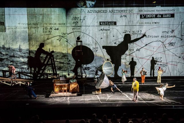 Here we see drawings by Kentridge the artist, maps, close up of the faces of soldiers and moving legs, and documents detailing those who died. The screen is sometimes a triptych in which shadows can move behind a seam and reappear in another section. African landscapes are not only beautiful but touching. They seem so remote from Sarajevo and the trenches. The war was carried on in Colonial Africa, divided up at the Berlin Conference of 1884-5, as well as continental Europe, territory of the colonizers.