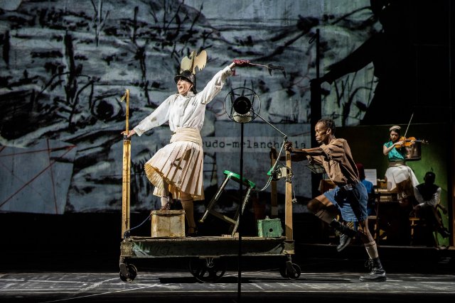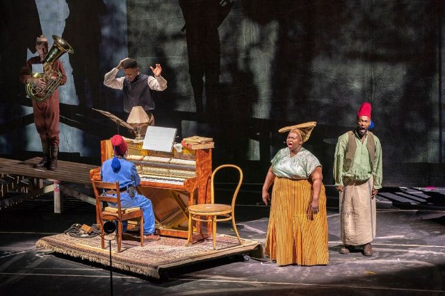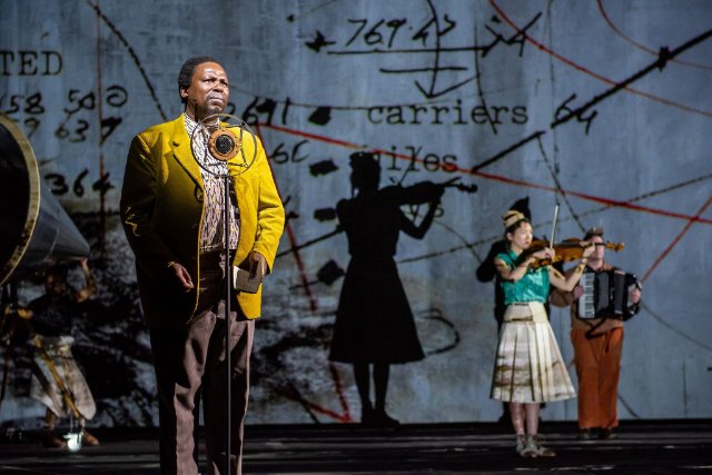 Wonderful cupboards open like Joseph Cornell boxes to reveal musicians from The Knights, performing on cello, accordion and other instruments. They are pushed across the stage, a better load than the porters frequently had to carry, but pushed with the giant steps carriers used. Hoisted on high are square filigreed tapestries whose beauty indicates their importance, but whose size indicated ‘load.’