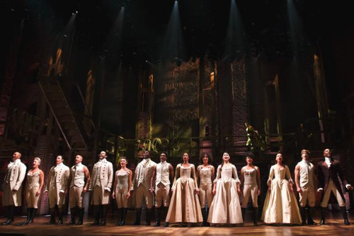 David Korins’ spacious two-level scenic design gives the entire company plenty of space to perform their magic in the colorful and elegant Revolutionary period costumes designed by Paul Tazewell.