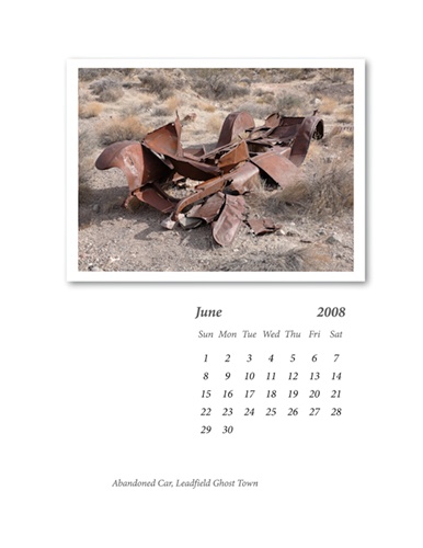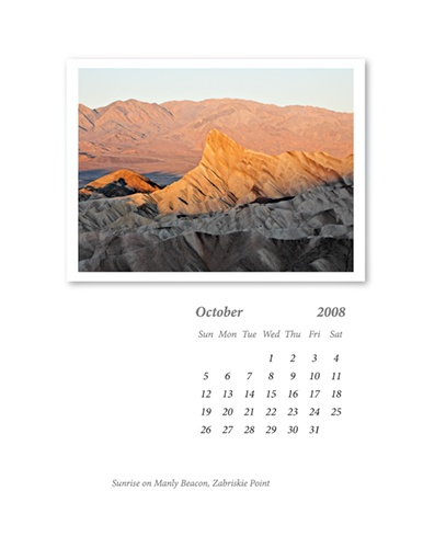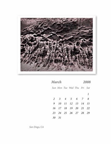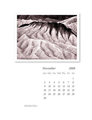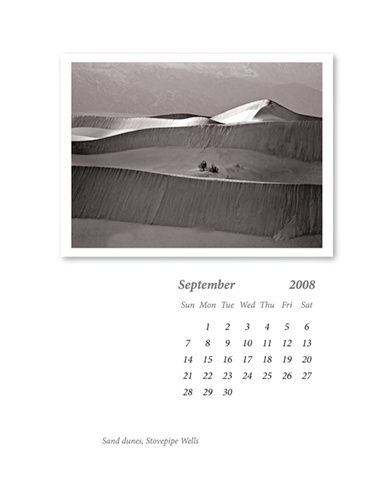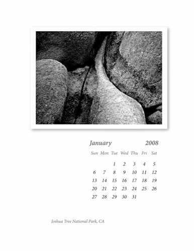 For 2008 I am offering three styles of letter-size calendars of my own photographs, individually printed on my Epson 2200 inkjet printer using Epson pigment inks on Epson Ultra Premium Presentation Paper. Each page has one image approximately 3.75 x 5" above the calendar for that month. The paper has a matte surface which is easy to write notes on, and the pages are unbound, making them suitable for framing if desired. Or you may simply use a magnet or thumbtack to mount each page to a suitable surface.