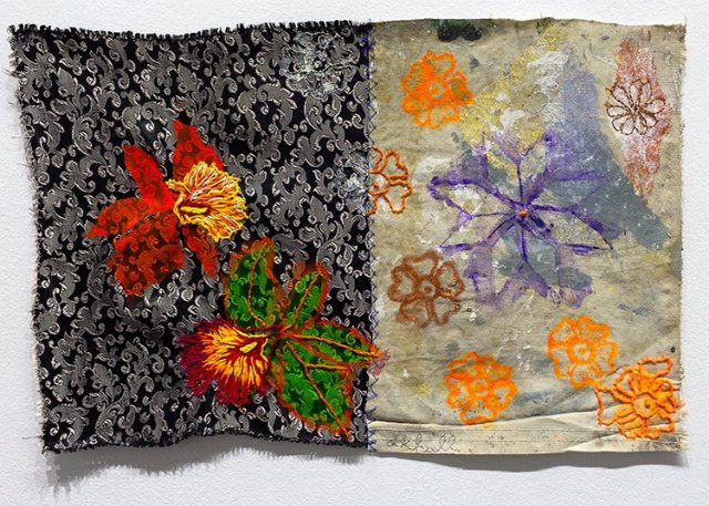 Deborah Kamy Hull writes, “Cross-Pollination integrates the traditions and methods of fabrication of ornamental textiles with those of abstract painting analogous to the transfer of pollen from one flower to (the stigma of) another; a sharing or interchange of knowledge and ideas for mutual enrichment; cross-fertilization. It can happen naturally or through deliberate effort.”