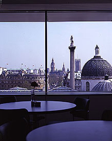 Before I left Boston, Charles Giuliano suggested that I treat myself to a lunch/snack and drink overlooking Trafalgar Square. He neglected to tell me what museum restaurant or café at which to do this. So, I went to the Sainsbury Wing of the National Gallery and climbed the stairs to their restaurant. After standing there for about 15 minutes, I asked one of the distracted hostesses if there was a window seat available. At the same time, I realized that the windows really didn't look out on much except mostly a brick wall. So I walked over to the older section of the National Gallery and asked at the information desk if there was a restaurant there. I was then directed to the top floor of the National Portrait Gallery.