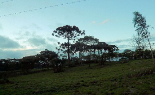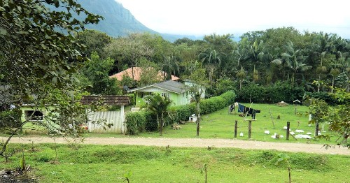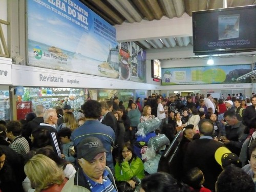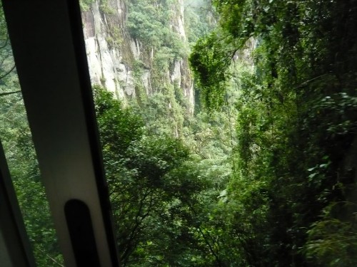 Pulling a long chain of cars to accommodate the 1200 passengers on board, the Serra Verde Express wended its way through the mountains, providing a panoramic view of the rain forest, home to many animals and birds who love the seeds of the Paraná pine, native to southern Brazil. As our train clung to the mountainsides, we crossed 14 of the 42 bridges between Curitiba and the coast, passing by canyons, rivers, waterfalls, and lush tropical vegetation. As we descended to sea level, the weather warmed to 20º C, still considered winter, as it gets very hot here in the summer, up to 48º C.