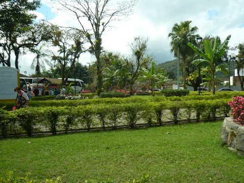 As we approached Morretes, farm houses appeared with children out front waving to us. It began raining as we landed. We waited out the rain over lunch at the Armazem Romanus Restaurant, known for its barreados — a traditional meat stew slowly cooked in a clay pot, sealed with dough from manioc flour, and served with sliced bananas and oranges. Following this hearty lunch, we walked about town and through a lovely park, returning to the train station for our journey back. The platform was filled with locals seeing off relatives, who had come for a visit. The railroad, in operation since 1885, also services freight trains, which deliver industrial goods, machinery, and car parts to rural towns and load up with farm goods such as soy, sugar, wheat, and cashew nuts to take back to the city. Traveling through fog and rain, we arrived back in Curitiba at dusk.